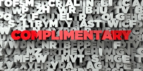 COMPLIMENTARY - Red text on typography background - 3D rendered royalty free stock image. This image can be used for an online website banner ad or a print postcard.