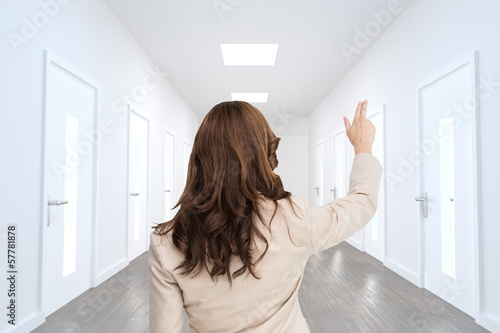 30s, woman, female, caucasian, looking away, white background, corridor, hallway, empty, white, wall, light, modern, floorboard, wooden floor, door, doorway, closed, hall, digital, computer graphic, business, corporate, professional, career, businesswoman, suit, well-dressed, smart, elegant, posh, stylish, sophisticated, copy space, pretty, attractive, brunette, brown hair, signs, finger, showing, pointing, gesture, hand, presenting, touching