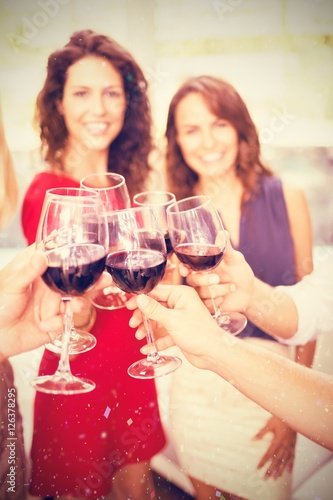 party, resort, portrait, youth, friends, friendship, beautiful, attractive, pretty, photogenic, holding, standing, smiling, cheerful, toast, wine, wine glass, alcohol, beverage, refreshment, together, happy, enjoyment, fun, joy, avocation, vacation, holiday, summer, lifestyle, carefree, celebration, freedom, companionship, spare time, free time, recreation, cropped, human hand, toasting, colours, flying