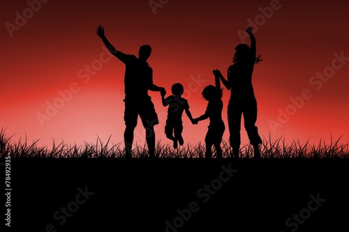grass, green, field, nature, environment, digital, computer graphic, sunrise, sunset, silhouette, black, mother, father, son, daughter, holding hands, jumping, leaping, joy, happiness