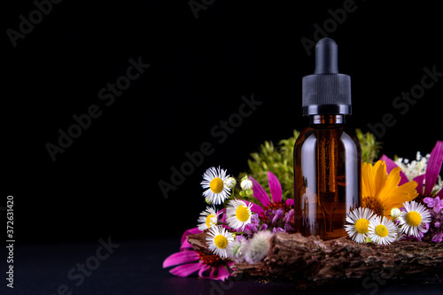 composition with glass bottle of body care organic cosmetics on tree bark pedestal with real , mosses and flowers. Cosmetic background mock up for product presentation.