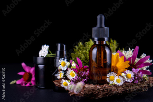 composition with glass bottle of body care organic cosmetics on tree bark pedestal with real , mosses and flowers. Cosmetic background mock up for product presentation.