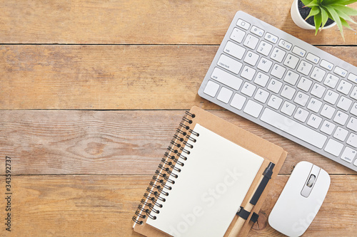 Computer Keyboard paper Notepad mouse plant on wooden table with copy space.