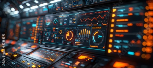 Computer Monitor Displaying Abstract Network Monitoring Dashboard with Real-Time Data Analytics