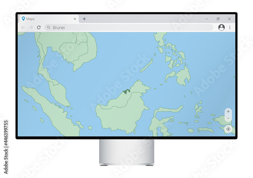 Computer monitor with map of Brunei in browser, search for the country of Brunei on the web mapping program.