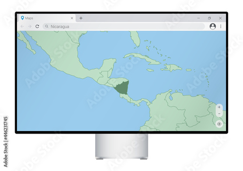 Computer monitor with map of Nicaragua in browser, search for the country of Nicaragua on the web mapping program.
