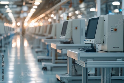 computer monitor, monitor, computer, assembly line, factory, manufacturing, production, industry, technology, electronic, automation, industrial, workspace, workstation, equipment, machinery, tech, future, progress, innovation, modern, contemporary, clean, bright, light, white, metal, desk, table, keyboard, cable, wire, line, row, organised, efficient, productivity, sterile, teamwork, collaboration, business, industrial design