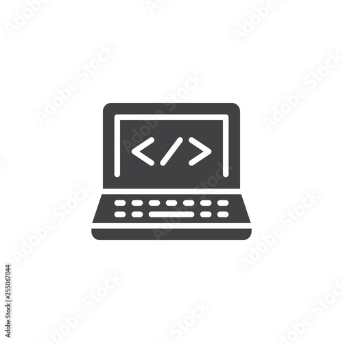 Computer Programming vector icon. filled flat sign for mobile concept and web design. Laptop Coding screen glyph icon. Symbol, logo illustration. Pixel perfect vector graphics
