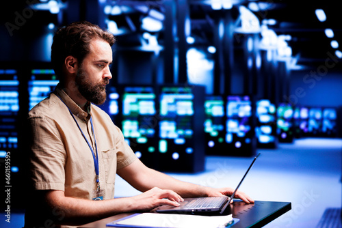 Computer scientist using laptop to patch up servers helping businesses manage databases, host websites and store files. Cloud computing business executive servicing supercomputers in data center