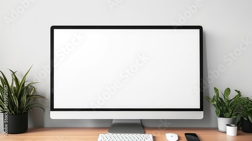 Computer screen mockup on office desk with mouse and keyboard