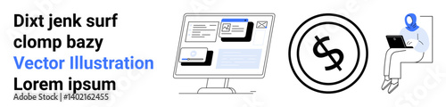 Computer screen showcasing online tasks, currency symbol representing money, and person using laptop. Ideal for digital business, online payment, remote work, fintech, e-commerce, productivity