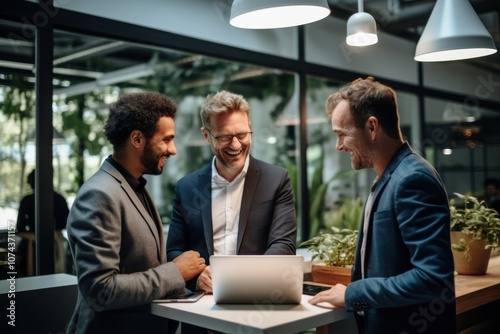 computer, laptop, office, talking, adult, accessory, poster, person, mobile phone, technology, phone, photo, plant, man, working, downloadable, goggles, meeting, human, table, face, head, lamp, like, planning, captured, moment, candid, business meeting, conversation, electronic, personality, agreements, happiness, teamwork, looking, image, three, togetherness, cooperation, discussion, co-worker, daylight, sitting