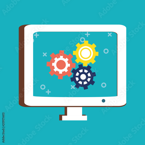 computer with gear wheels on screen over blue background, colorful design. vector illustration