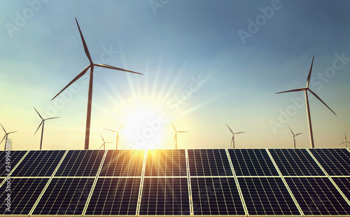 concept clean energy power in nature. solar panel and wind turbine with sun background