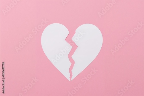 Concept of a fractured heart. White paper heart ripped against a pink backdrop