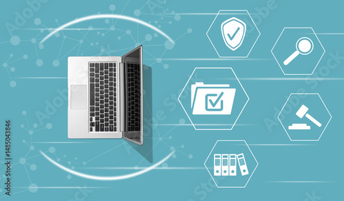 compliance, governance, management, legal, regulation, laptop, information, company, symbol, business, strategy, quality, inspecting, process, concept, rule, agreements, risk, standard, technology, policy, hexagon, law
