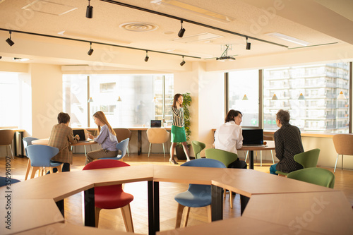 backview, horizontal, long hair, short hair, black hair, brown hair, grey hair, table, laptop, indoor, sitting, sapporo, japan, missy, japanese ethnicity