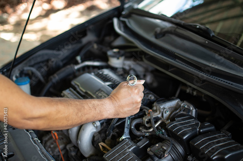 Concept of engine maintenance. Mechanics hold a wrench to tighten bolts in engine repairs. Black car, engine turned off. Engineers are checking the combustion system of cylinders. Blurred background