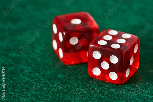 concept of gamble casino red dice on green background. gamble casino red dice on green background. close up gamble casino red dice on green background