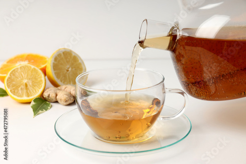 white, glasses, ginger, cup, antioxidant, teapot, teacup, aroma, water, leaf, beverage, liquid, tea, background, orange, hot, lemon, taste, drink, natural, herbal, black, healthy, health, light, mug, slice, vitamin, fresh, lifestyle, closeup, herb