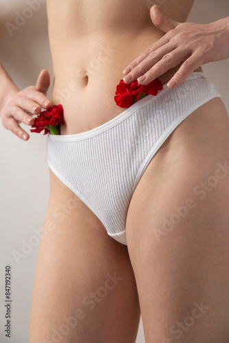 Concept of Menstruation with Woman in White Underwear and Carnations