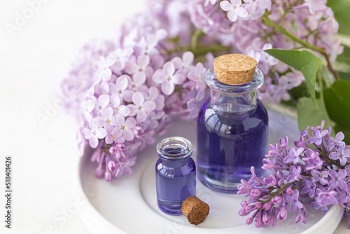 Concept of pure natural organic plant-based ingredients in cosmetology, herbal and flower extract. Lilac for anti-age and anti-acne therapy, gentle face and body skin care