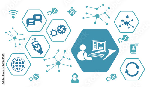 conference, teleconference, web, network, technology, media, digital, telecommuting, distance, global, cyberspace, computer, social, team, chat, online, work, hexagon, communication, home, concept, workplace, meeting, business, laptop, people, icon, teamwork, connection, remote