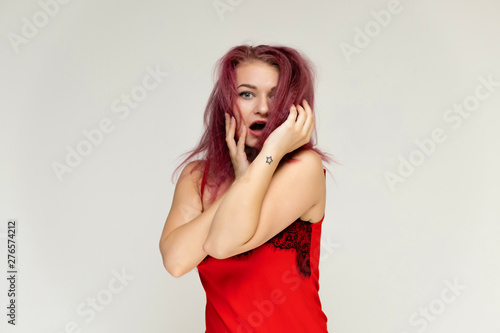 Concept portrait of a pretty sexy girl with purple hair in beautiful red lingerie on a white background. She smiles, happy with life, happy. Hair flying, front view. Made in a studio.