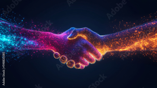 handshake, light, glowing, oneness, collaboration, digital, abstract, colourful, technology, connection, partnership, agreements, interaction, neon, bright, creative, futuristic, design, visual, art, teamwork, innovation, energy, spark, vibrant, hand, gesture, communication, illustration, concept, modern, representation, synergy, harmony, effect, aglow, colours, artistic, network, symbol, three-dimensional