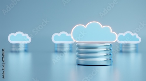 Conceptual illustration of cloud storage with metallic database stacks, representing digital data management and technology advancements.