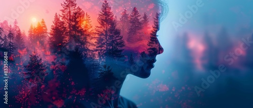 conceptual illustration with fantasy elements, mythical creatures, focus on, bold hues, Double exposure silhouette with enchanted forests