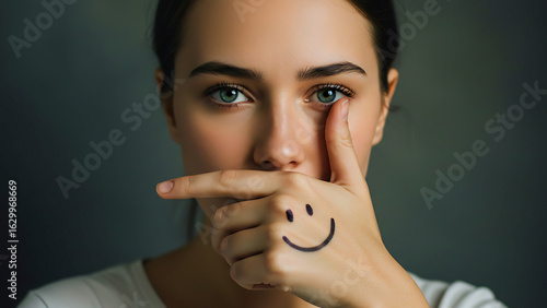 Conceptual portrait of a beautiful woman hiding her sad emotions and depression behind a fake smile drawn on her hand.