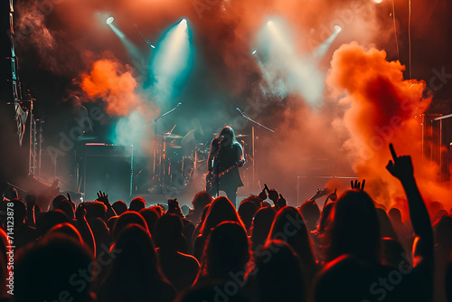 Concert stage, crowd in the stadium, in the style of misty gothic, dark teal and orange, punk rock aesthetic, metal.
