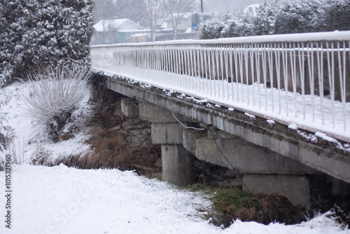 snow, winter, cold, season, slow, temperature, mountain, flowing, clear, bridge, covered, crystal, stream, running, water, moving, white, creek, ice