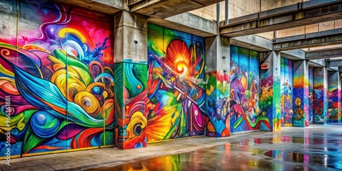 Concrete Canvas A symphony of colors and textures, reflecting on a wet surface. ,Graffiti ,Urban ,Art