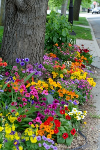 Concrete Jungle Blossoms: A Burst of Spring Color in a Sidewalk Tree Pit with a Mix of Annuals and Perennials