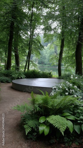 Concrete platform amid green trees by calm lake shore featuring lush ferns and white wildflowers creates a tranquil outdoor scenery