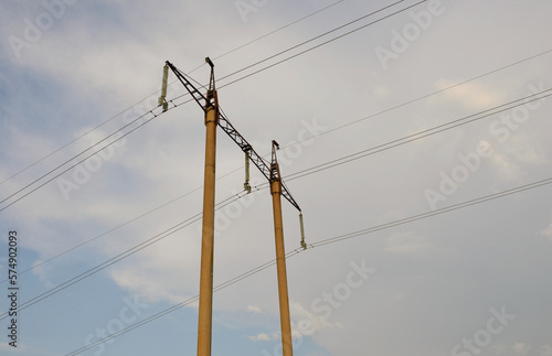 concrete poles with power lines against the sky at sunset. wires are stretched and are under high voltage. transmission of electricity over long distances