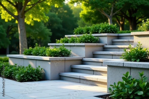 Concrete tiered retaining wall, modern design, clean lines, geometric, concrete