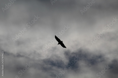 Condor voando abaixo de nuvens de tempestade, abutres do Novo Mundo o Urubu, Cathartidae