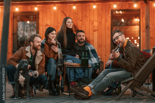 Coneption of weekend. Group of people is together near beautiful wooden building at evening time