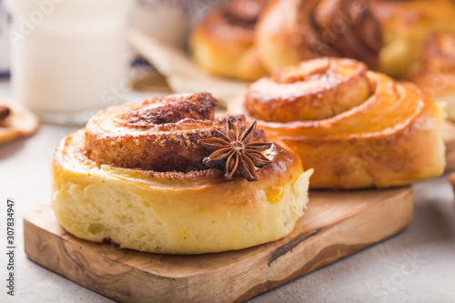 Confectionery baking. Sweet fresh soft roll bun with cinnamon on concrete background. Christmas food recipe