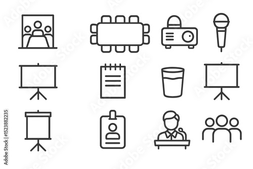 conference, icon, microphone, projector, presenter, audience, notepad, screen, meeting, seminar, workshop, presentation, speaker, lectern, group, card, identification, badge, drink, glasses, communication, setup, equipment, multimedia, display, technology, projection, stage, board, planning, discussion, note, participant