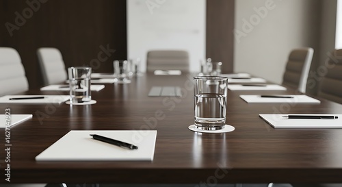 Conference Room Setup: A meticulously arranged conference room, featuring a polished wooden table, crisp white notepads, transparent water glasses, and elegant leather chairs, is ready for a meeting.