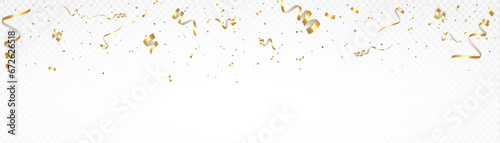 Confetti on a transparent background. Falling shiny golden confetti. Bright golden festive tinsel. Holiday design elements for web banner, poster, flyer, invitation. Vector