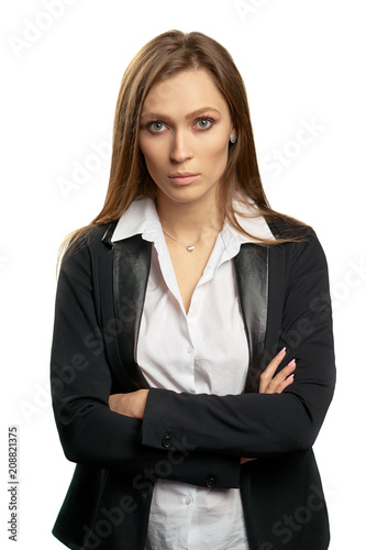 Confidence and charisma. Young business woman in suit looking at camera isolated on white background.