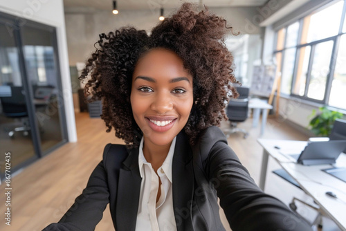 Confidence, professionalism, positive attitude, finding job in the workplace. African-American businesswoman entrepreneur in suit newbie taking a selfie in a modern office environment.