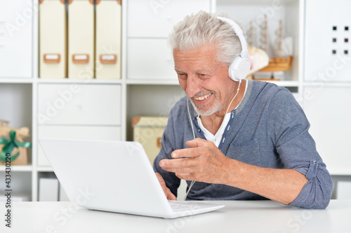 colours, confident, excited, grey, hair, happy, earphones, home, indoor, joyful, laptop, male, man, 1, people, person, senior, sitting, smile, smiling, table, tech, technology, use, using, white, wireless