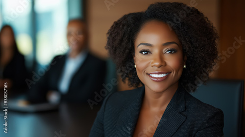 confident, female, professional, african american, grinning, camera, seated, modern, conference, table, blurred, colleague, smiling, workplace, diversity, teamwork, leadership, business, meeting, success, environment, attire, posture, collaboration, sharpened, positivity