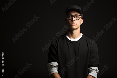 Confident and stylish young adult man in casual clothes, wearing glasses, posing against a black wall.